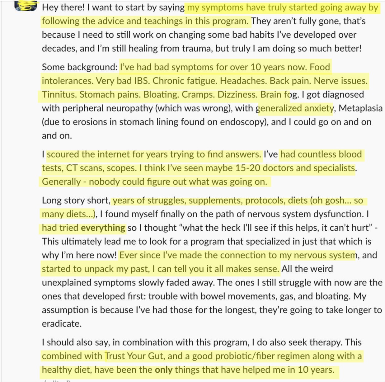 Before this program, I didn’t fully grasp how my nervous system had been impacted by trauma, or how that was affecting my gut. This program is the only resource I’ve found that truly connects all the dots. It has made a huge difference in my overall health!